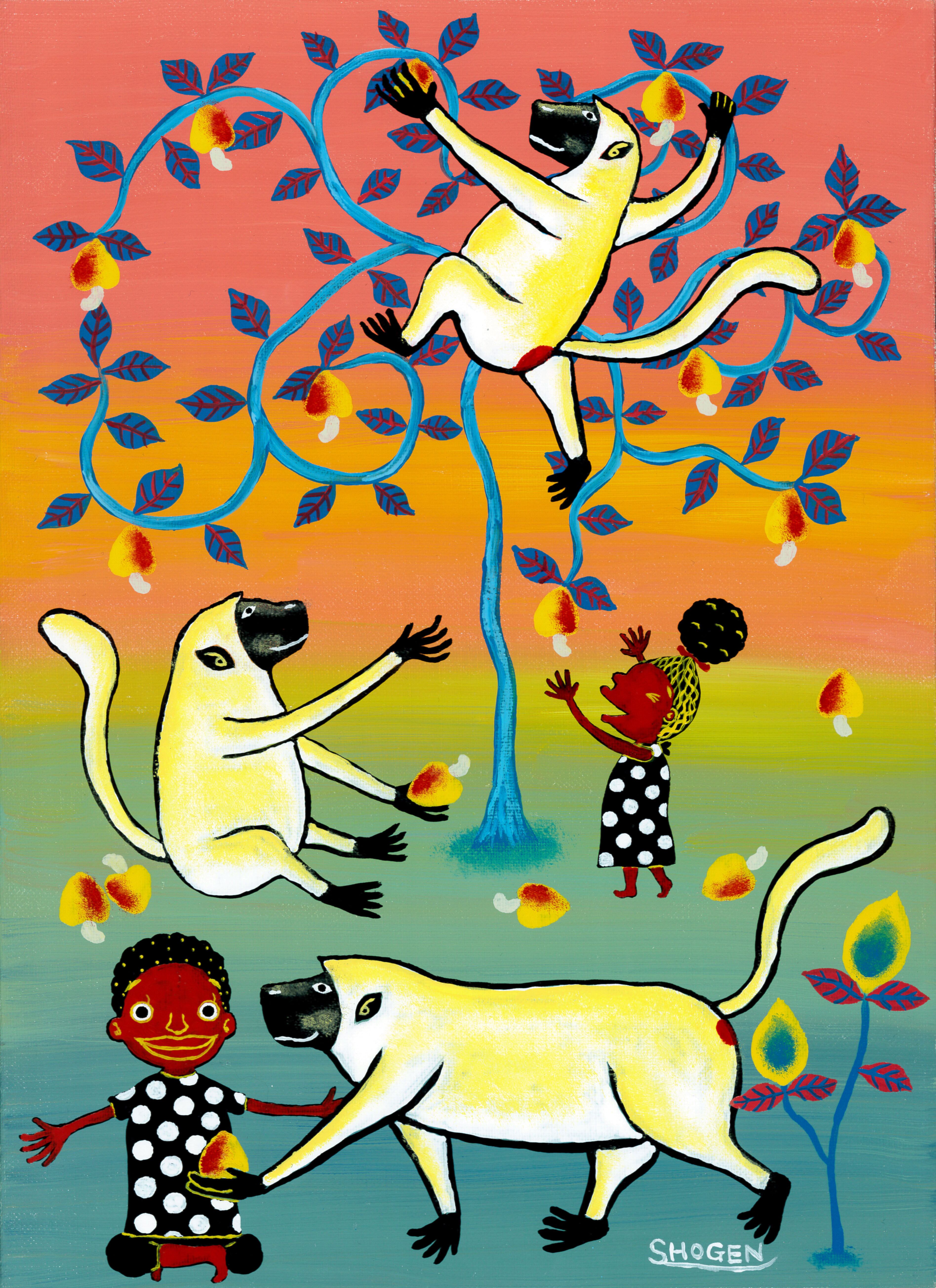 〇カシューナッツを収穫するサバンナモンキーと子供たち(29.7×21㎝)