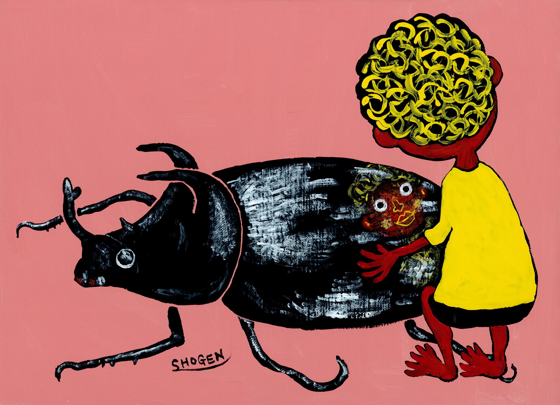 ボルネオ島に住む固有種のカブトムシ・モーレンカンプのつるつるの背中に映り込むクリスくんを描きました。