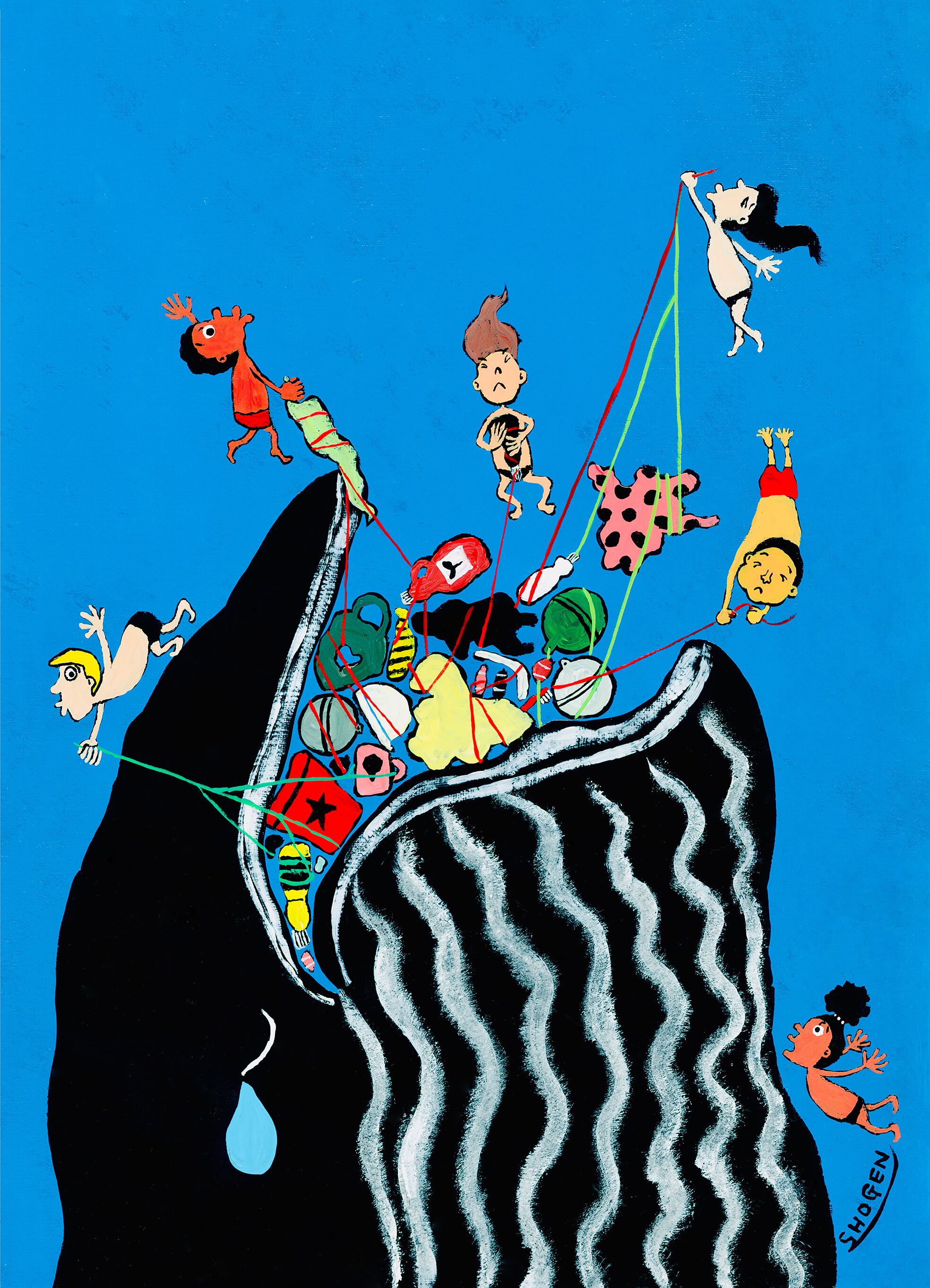 クジラのお腹に入ってしまったゴミを引っ張り出そうとする世界の子どもたちを描きました。